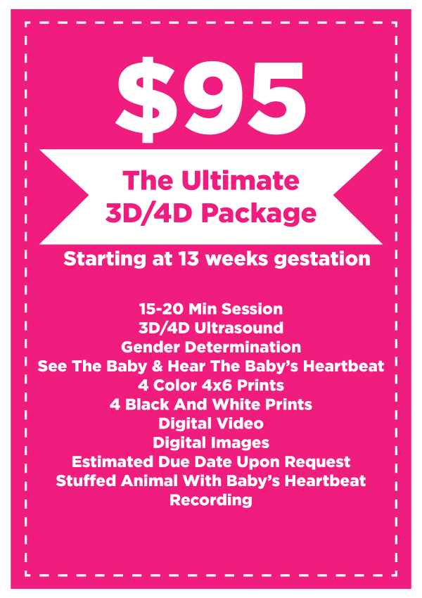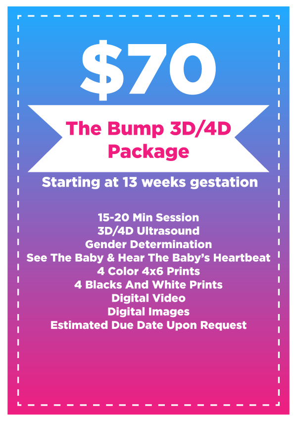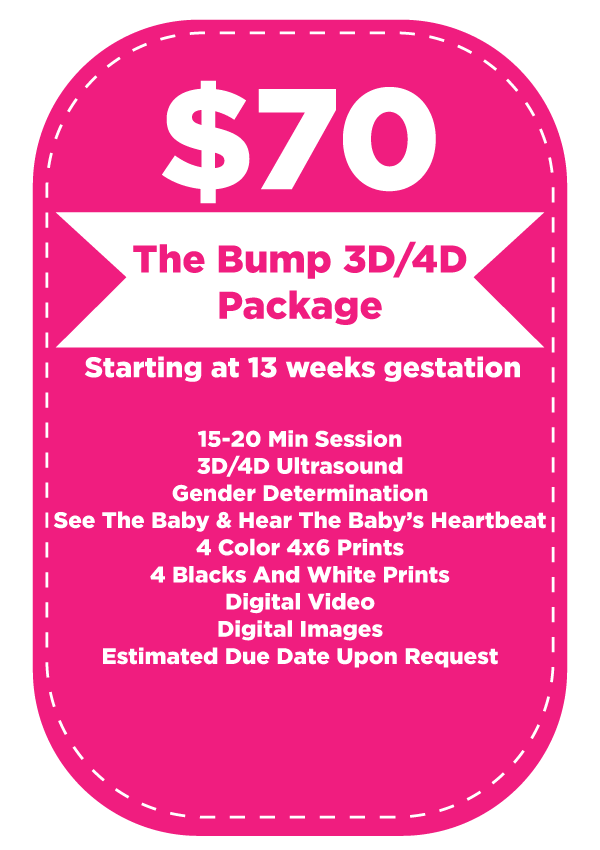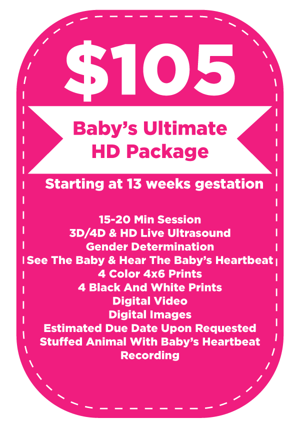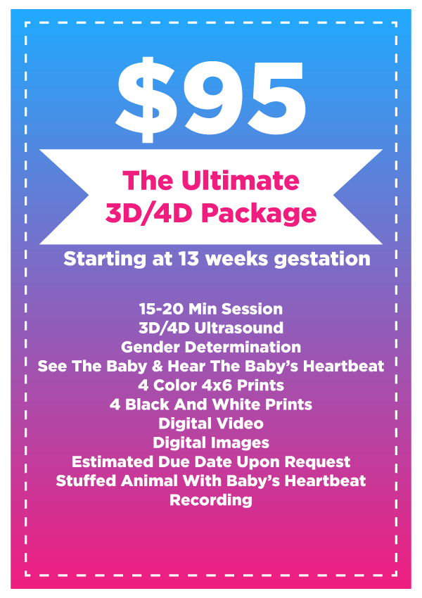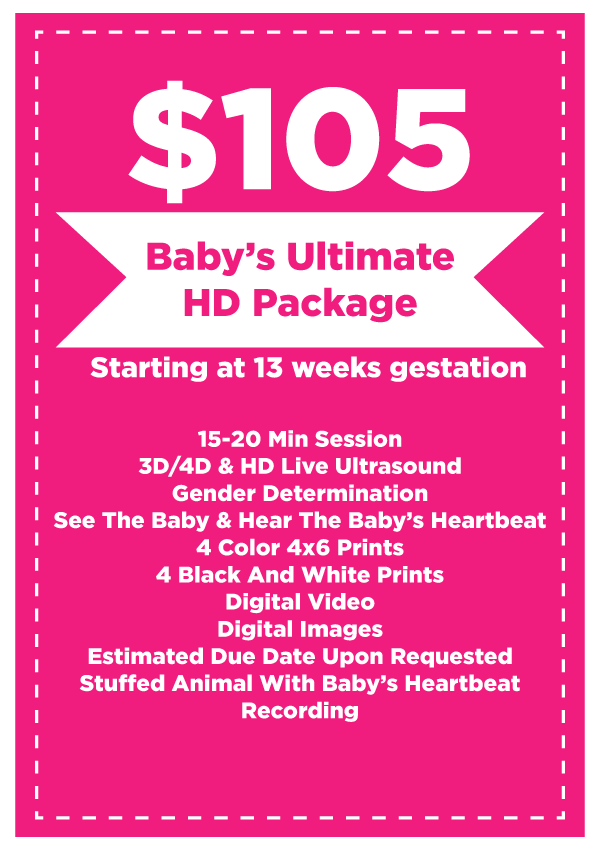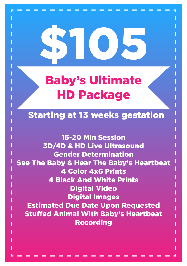 We recommend 3D/4D Ultrasounds for women over 27 weeks; however, we start at 13 weeks to determine gender if the client meets certain requirements. If, for any reason, Baby’s First Photos cannot determine age, or if the baby does not show, we will invite you back to Baby’s First Photos to repeat your session for free.