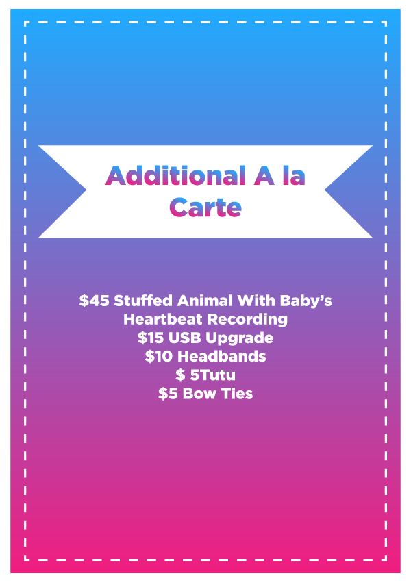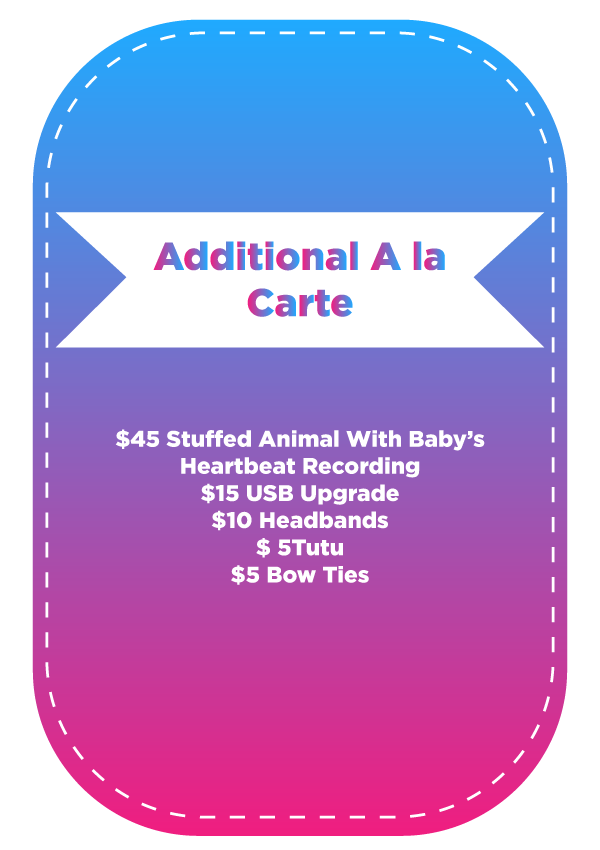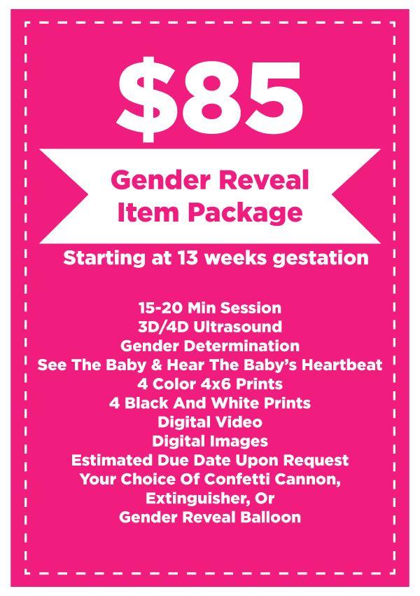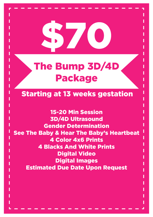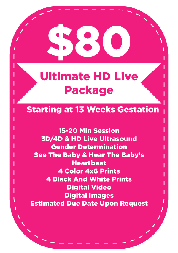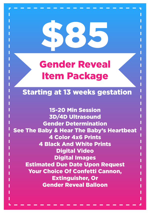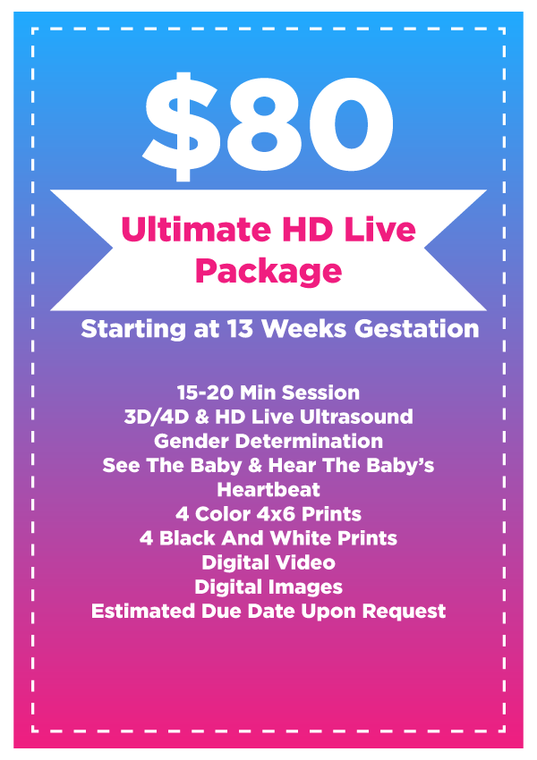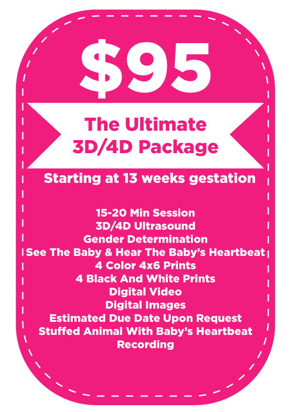 We recommend 3D/4D Ultrasounds for women over 27 weeks; however, we start at 13 weeks to determine gender if the client meets certain requirements. If, for any reason, Baby’s First Photos cannot determine age, or if the baby does not show, we will invite you back to Baby’s First Photos to repeat your session for free.
